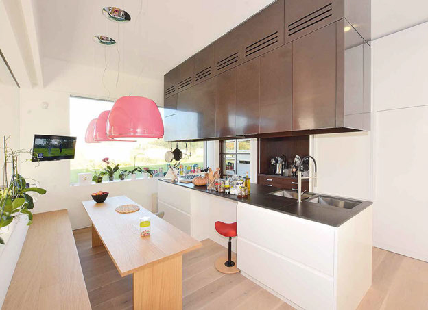 la cucina, altra zona audio/video; sono KitchenAid le soluzioni per la cottura e il raffreddamento dei cibi, Elica la grande cappa centrale.