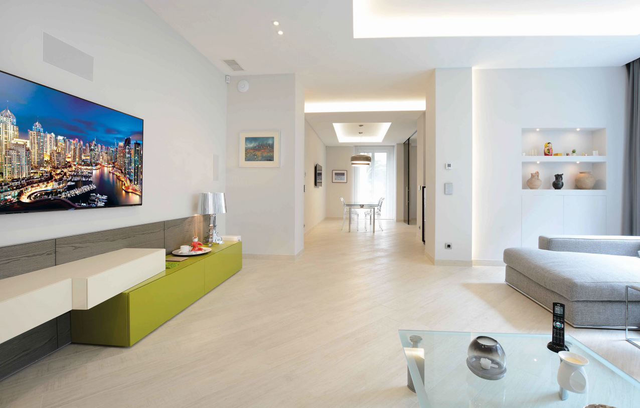 In questo contesto Massimo Marucci, del centro di installazione Audiotime, di Viterbo, è stato chiamato per la progettazione di un sistema di automazione/intrattenimento completo, che coinvolgesse tutti gli aspetti e le funzionalità gestibili all’interno di un appartamento, come illuminazione, clima, videosorveglianza, automazione tende e tapparelle, intercom, intrattenimento home theater e diffusione multiroom audio e video in tutta casa.