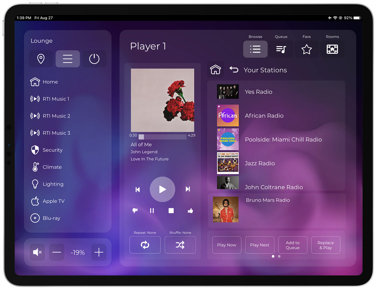 L’esperienza di RTi Music è coerente su tutti i dispositivi, dal telefono cellulare al telecomando, dal pannello tattile montato a parete alla TV a grande schermo se abbinato a un processore RTi XP-8v.