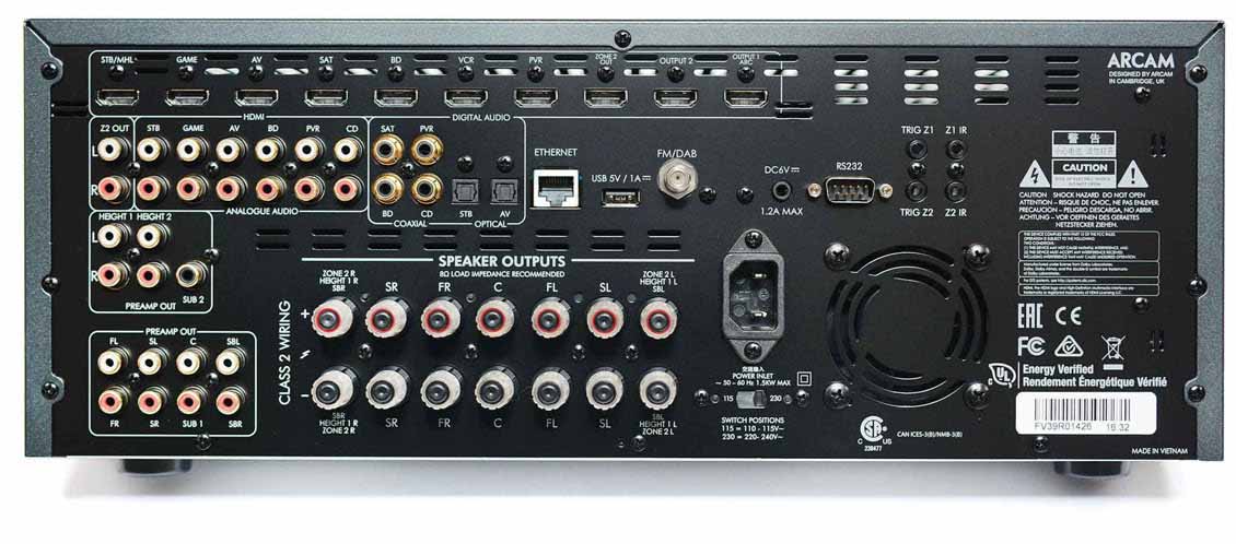 L’ampio spazio a disposizione ha consentito di collocare i morsetti altoparlanti alla giusta distanza l’uno dall’altro, sicché le operazioni di cablaggio sono agevolate. Non mancano le uscite per la Zona 2, presenti nelle versioni HDMI, speaker e linea. La qualità della riproduzione – la leggendaria qualità Arcam! – è esaltata dalla funzione di auto equalizzazione ambientale Dirac Live; in dotazione sono forniti il microfono di calibrazione e la scheda audio USB, mentre il software dev’essere scaricato dal sito Arcam.