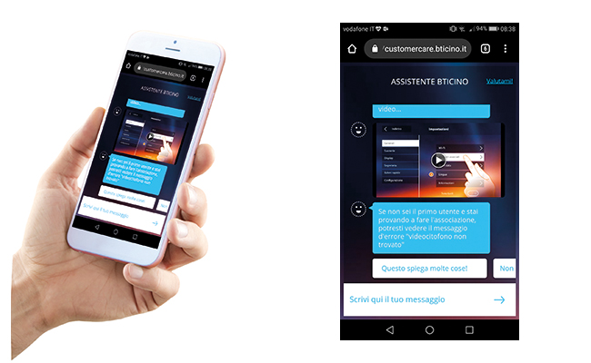 Assistente BTicino è multifunzionale: guida in modo facile e intuitivo il cliente al miglior utilizzo e alla risoluzione di eventuali problemi legati al videocitofono. Si presenta come un avatar senza alcuna connotazione di genere. Assistente BTicino comunica attraverso immagini, video e testi, con un linguaggio cordiale e informale per mettere a proprio agio il cliente, impiegando «emoticon» ed espressioni semplici, capaci di rendere gradevole il colloquio.
