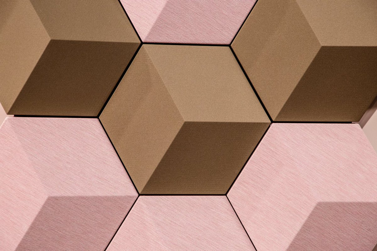 Il sistema è composto da diffusori modulari a riquadri esagonali, disponibili in una vasta gamma di colori e tessuti, che possono essere disposti e configurati liberamente a parete.