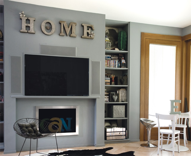 Il secondo impianto, invece, è rappresentato dall’home theater nel classico schema 5.1, ma se l’hi-fi è lasciato in bella mostra, quasi esaltato esteticamente, l’home theater è dissimulato. Perfino il generoso display LCD da ben 70″ che ne rappresenta il fulcro sembra essere meno presente, ben integrato nella struttura del camino/libreria, invece i diffusori sono tutti incassati a parete.