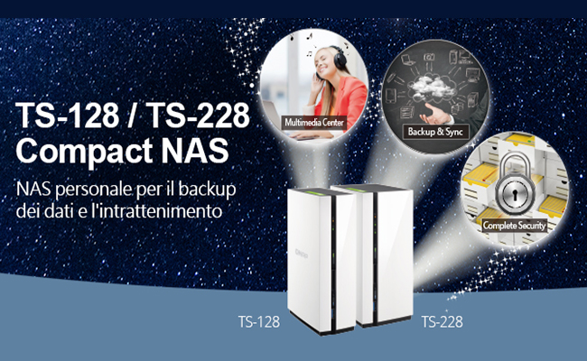 QNAP Systems Inc. annuncia il lancio dei Compact NAS dual-core a basso consumo e dal costo contenuto: il TS-128 a 1 bay e il TS-228 a 2 bay. Sviluppati nel formato mini-tower per un ingombro minimo sulla scrivania, sono la scelta ideale per gli utenti privati che vogliono creare il proprio personal cloud. Il nuovo NAS semplifica la gestione delle operazioni di backup e sincronizzazione dei file, oltre a offrire l’accesso da remoto e una ricca varietà di app multimediali, che arricchiscono lo stile di vita digitale.