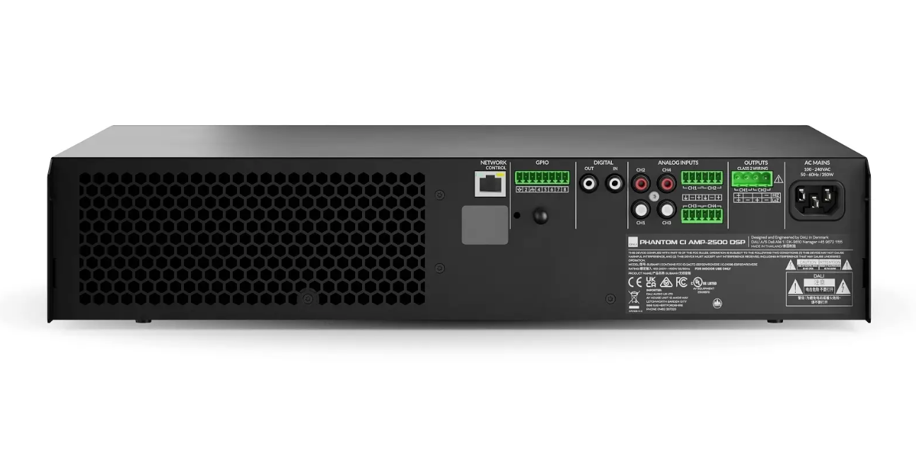 Dotato di 2 x 500 watt di amplificazione in classe D, il Phantom CI AMP-2500 DSP è capace di erogare una grande potenza senza sforzo grazie all’efficienza estremamente elevata e alla bassa distorsione. L’ampli può anche essere installato a rack e collegato a ponte, in mono, situazione in cui è in grado di arrivare ad erogare 1.000 watt. Dispone di controllo adattivo della ventola, che mantiene il rumore al minimo. Dispone anche di DSP (Digital Signal Processing) e interfaccia web per la configurazione. Il DSP integrato consente preimpostazioni specifiche per ottimizzare la resa con gli speaker serie CI, per la migliore esperienza sonora possibile nel proprio impianto audio.