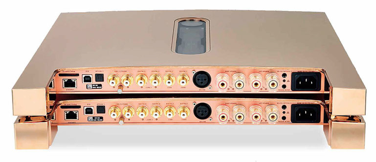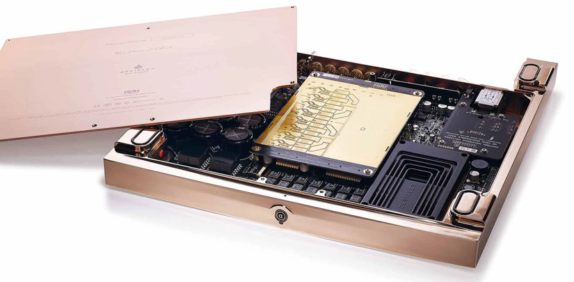 L’Original d’Atelier è un progetto ideato da Pierre-Emmanuel Calmel, il capo dei progettisti di Devialet, che ha voluto per questo specialissimo amplificatore che già ad una prima occhiata fosse subito chiara la sua esclusività. Rimane il profilo slim, caratteristico della linea, ma appare subito evidente la colorazione effetto rame del telaio, anzi dei tre telai: i due telai mono dell’amplificatore vero e proprio e il voluminoso telecomando. La struttura dell’Original d’Atelier è in alluminio scavato dal pieno così da offrire la massima solidità al tutto e allo stesso tempo un efficace sistema di smaltimento della temperatura. Anche se quelli utilizzati da Devialet sono dei moduli in Classe D, notoriamente più controllati nel produrre calore, la potenza a bordo è tanta e ben venga l’alluminio a tenere sotto controllo i bollenti spiriti. In realtà quella di Devialet è una Classe D fortemente personalizzata al punto che viene definita Classe ADH, una struttura ibrida dove (per sintetizzare al massimo) abbiamo i vantaggi di potenza di una tipica Classe D uniti alle qualità sonora di una Classe A.