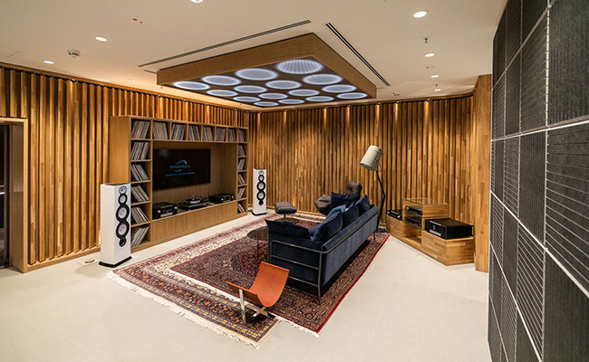 Il design del Luxury Audio Studio (che si sviluppa su ben 136 mq) ha un approccio unico, che immerge i visitatori in un’atmosfera con strati e trame vintage sparsi in tutto lo spazio. Per certi versi simile al loft di un musicista, lo studio contiene una sala stereo con una parete piena di dischi in vinile, una sala conferenze e una dispensa. In alto, le lamelle di legno sono perforate per una rigorosa attenuazione del suono. A completare l’esperienza c’è poi l’impianto home theater all’avanguardia, da utilizzare come terreno di prova per gli ultimi prodotti Harman e capace di fornire al contempo un’esperienza luxury a casa.