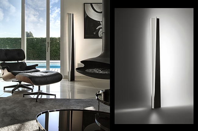 Reverse (foto apertura e sotto) è caratterizzato dalla purezza di elementi geometrici; sottili lamine metalliche si affiancano e si rincorrono come fogli di carta o pagine di un libro, generando piani che si avvicinano ma non si intersecano e non concedono spazi alla curva. Da questi parallelismi nascono le linee luminose e il corpo illuminante diventa uno scrigno da cui si sprigiona la luce.