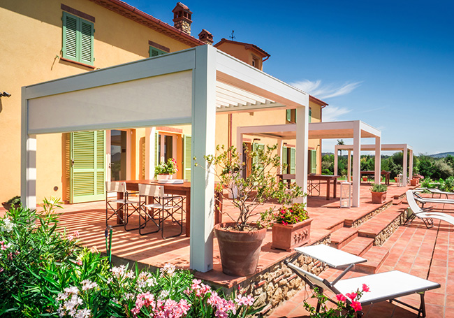 Nel corso della ristrutturazione del casolare di campagna sito a Bibbona (Livorno), nell’alta Maremma toscana, un committente privato si fa convincere da Vivere il Fuori (Rivenditore KE) per installare sullo spazio antistante la costruzione 3 pergole bioclimatiche Kedry Prime, impreziosendo così l’outdoor già riqualificato con i nuovi lavori. L’abitazione, infatti, dotata di piscina e di un’ampia zona antistante adibita a living estivo e solarium, necessitava di strutture con le giuste dimensioni, che consentissero di arredare lo spazio, senza essere invasive nei confronti della facciata.