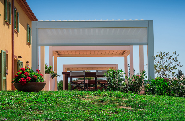 Il committente privato ha ritenuto il prodotto – che qui si estende per 44 mq – vincente, proprio perché in grado di assecondare il suo desiderio di poter sfruttare la pergola come una “veranda”, ideale per godere dell’outdoor nelle stagioni intermedie.