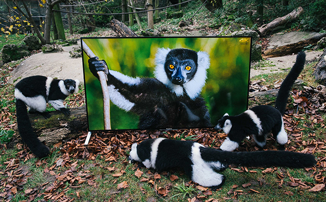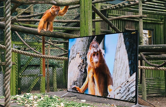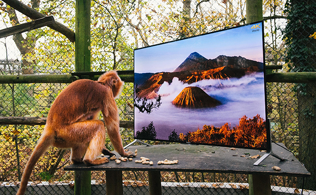 Lemuri e colobini della rierva naturale di Port Lympne (Gran Bretagna) guardano un TV Sony 4K che riproduce immagini identiche a quelle reali: l’esperimento è parte rilevante all’interno del programma di reinserimento in natura.