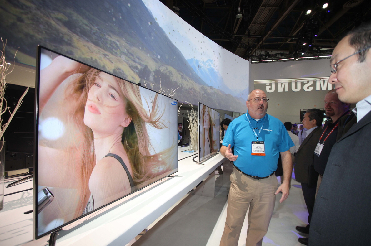 A seguire è la volta dei display UHD (Ultra High Resolution), quindi dei 4K (3.820 x 2.160 pixel). Anche in questo settore Samsung stupisce perché, dall’alto dei suoi 85″, l’UN85S9 è il più grande display LCD con questa risoluzione, 1″ in più rispetto ai concorrenti. Per ora è previsto per il solo mercato americano e al suo fianco è stato mostrato anche il prototipo del fratello maggio da ben 110″. Le immagini prodotte sono spettacolari, davvero, e anche l’audio appare molto curato, con sezioni alti e bassi separate. Ciliegina sulla torta, il singolare piedastallo, formato da cornici di metallo interconnesse e, quindi, orientabili. Il costruttore parla di design “flottante”, ma il risultato è, almeno dal punto di vista estetico, discutibile.