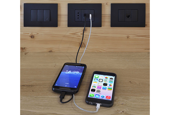 Ad Arké – scelta nella versione Classic e caratterizzata dalla geometria razionale, il profilo lineare e gli angoli netti – è stato affidato il compito di portare il giusto tocco di contemporaneità negli spazi interni. Il materiale scelto in questo caso è il tecnopolimero color nero, lavorato con l’attenzione per le finiture tipica dell’inconfondibile stile di Vimar e trattato con procedimenti eco-friendly e verniciature anti usura. I dispositivi Vimar controllano e gestiscono con precisione illuminazione ed energia elettrica in tutti gli spazi, garantendo al contempo funzionalità e comfort. Nelle camere, ad esempio, l’ampia gamma di prese – da quelle specifiche per rasoi posizionate nei bagni, a quelle dati – risponde ad ogni tipo di esigenza funzionale: come ad esempio quelle USB da incasso, che permettono di ricaricare anche i dispositivi che necessitano di maggiore corrente (come i tablet da 10”) in tutta velocità.