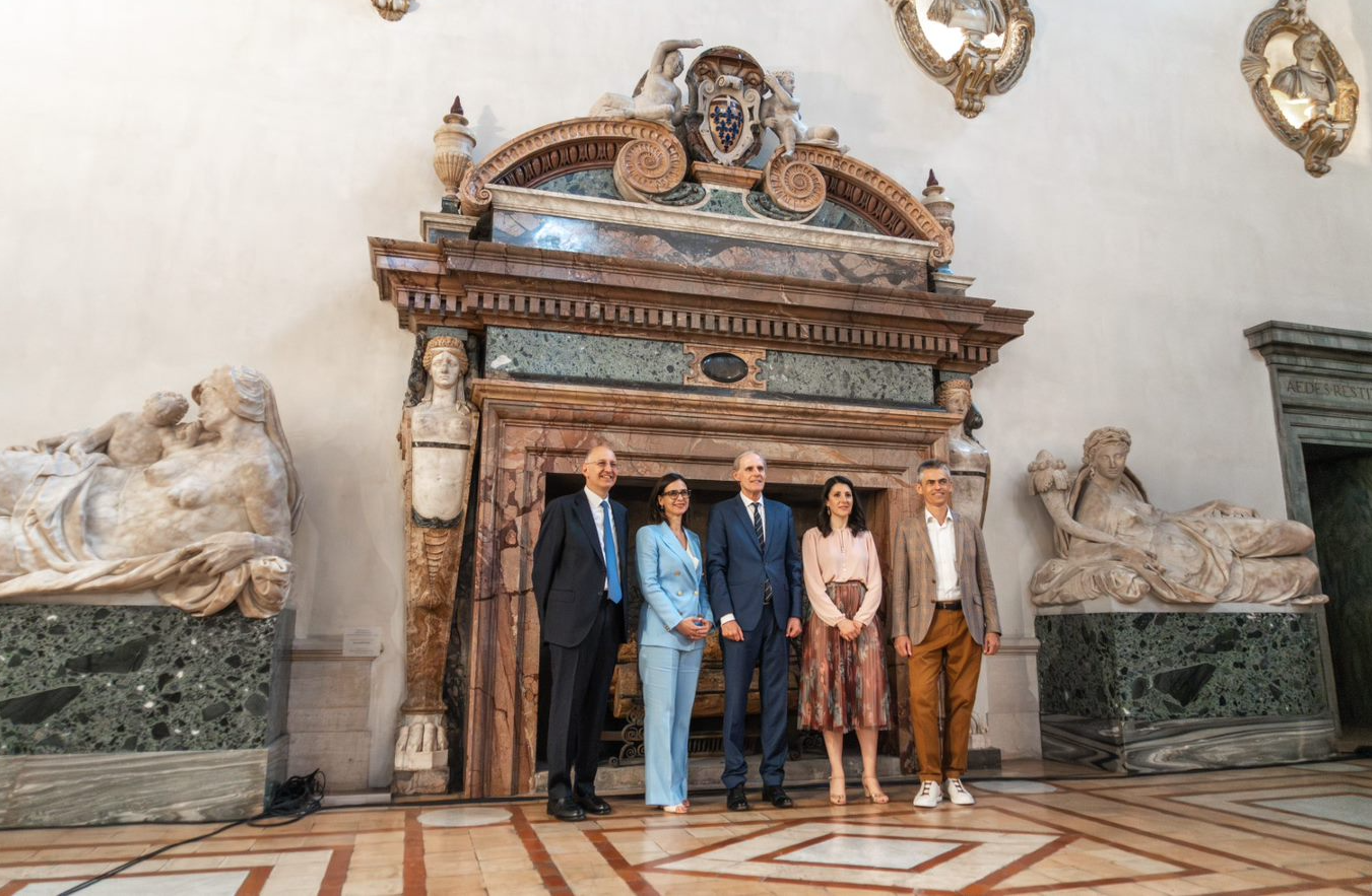 A Palazzo Farnese, “aperto per lavori”, tornato a splendere il camino e le statue allegoriche del Salone d’Ercole grazie a…