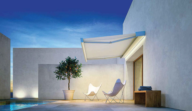 La tenda T-Hide di Pratic, dal design essenziale, è dotata di un sistema di tensione del braccio la cui movimentazione motorizzata è azionabile con telecomandi a più canali o con il sistema di domotica Connexoon, che permette di avviare il funzionamento da smartphone tramite l’app dedicata. Gli strip led con luce dimmerabile risolvono l’aspetto dei punti luce sotto la tenda. Protezione anche