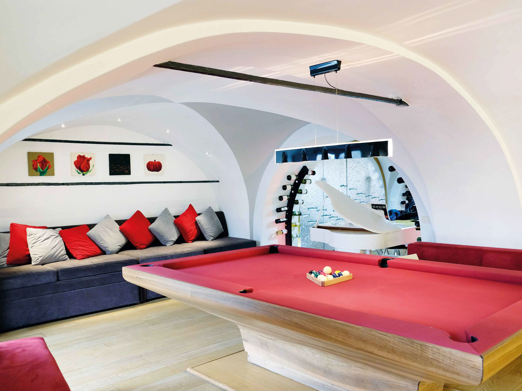 In primo piano il biliardo con panno rosso firmato MBM Roma.