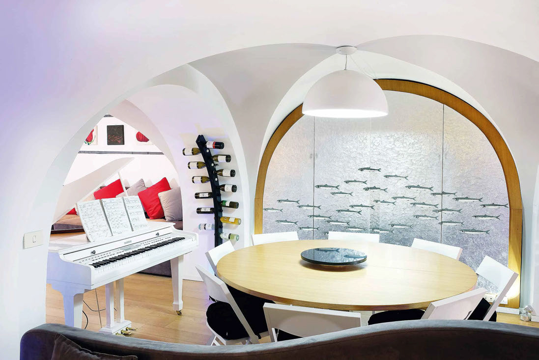 “Individuo e Società”, è l’opera realizzata da Massimo Catalani con polvere di marmo di Carrara, sabbia vulcanica e pigmenti fotoluminescenti su tavola. L’ opera colora le ante di un armadio guardaroba e raffigura un branco di alici. Il tavolo, ad alzata elettrica ed allungabile, con piano in marmo nero assoluto, come le vinerie “arcate” sono stati realizzati su misura da “Fratelli Marmo”.